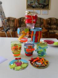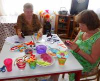 Вчера участники кружка занимались очень интересным и необычным творчеством. Все вместе они украшали бокалы различными лентами, бусинами и аппликациями. Это была совершенно новая техника рукоделия для некоторых участников. Мы научились работать с полиэтиленовым клеем и сделали замечательные украшения для праздничного стола.