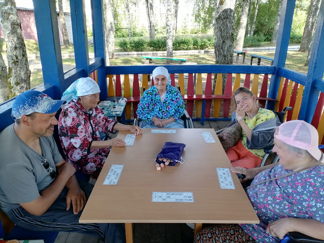В такую жаркую погоду мы нашли отличный способ провести время и немного прохладиться! Мы собираемся в тени и с увлечением играем в русское лото!