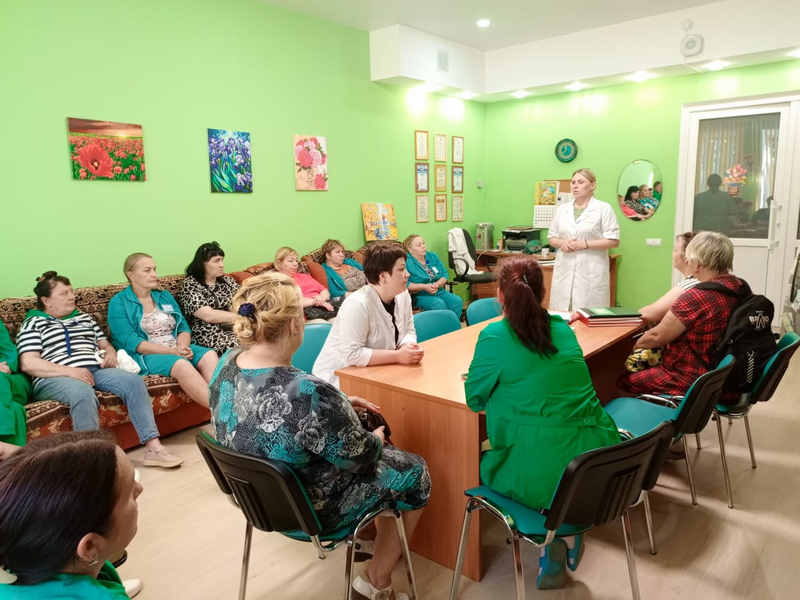 Сегодня в отделении милосердия № 1 прошло важное собрание с сотрудниками, на котором выступила заведующая отделением Виалетта Валерьевна.