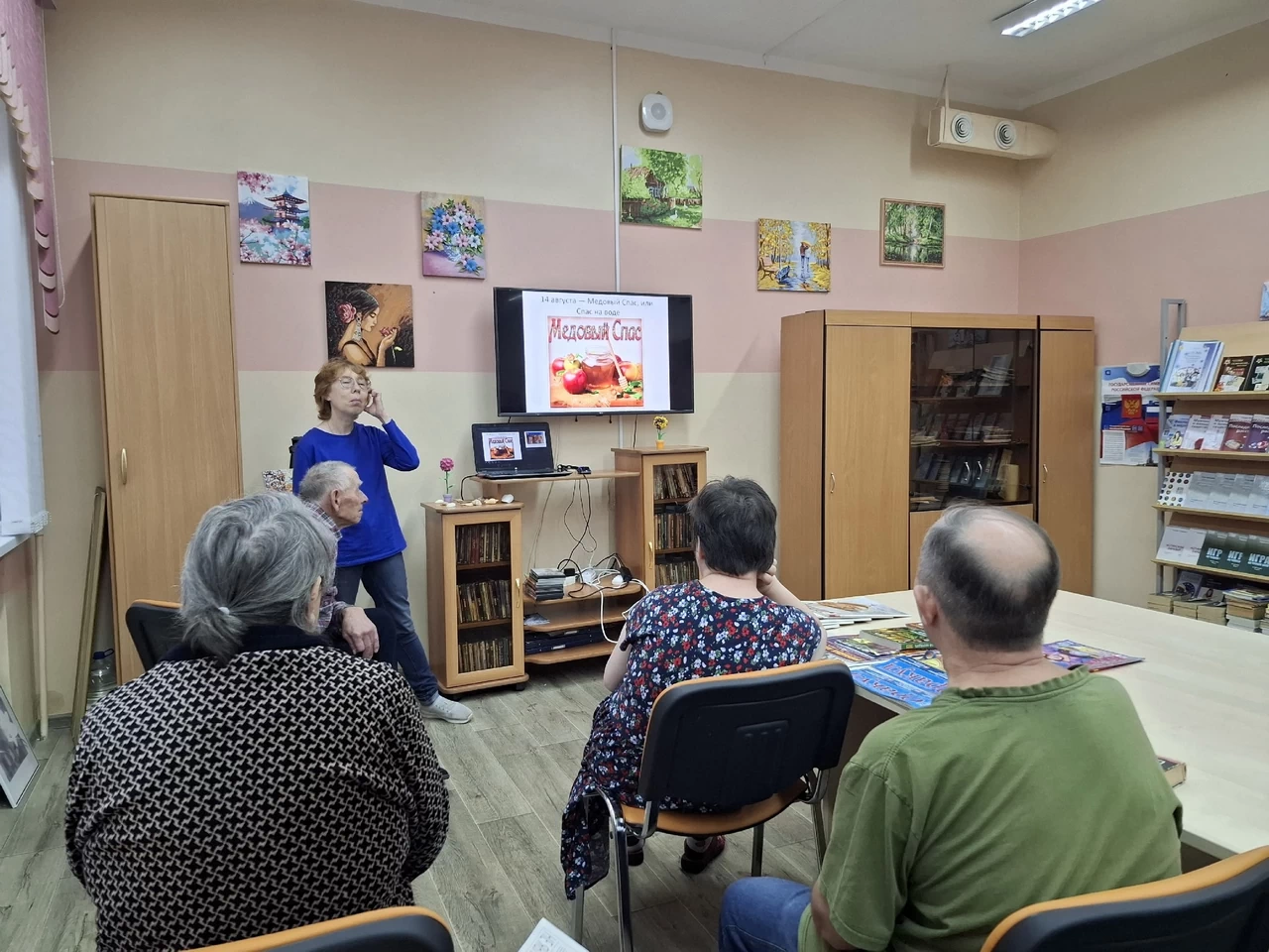 Библиотекарь рассказала жителям дома-интерната о главных праздниках месяца: Ильине дне, Преображении Господнем, Успении Пресвятой Богородицы.